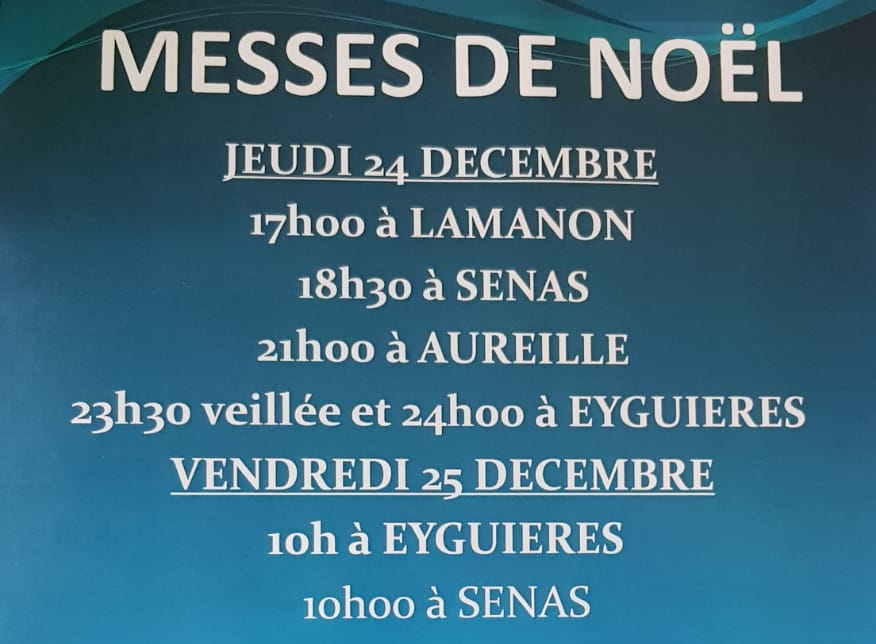 Voilà les horaires des messes : Jeudi 24 Décembre : 17h00 à Lamanon – 18h30 Sénas – 21h00 Aureille 23h30 veillé et 24h00 à Eyguières Vendredi 25 Décembre10h00 à Eyguières et à Sénas Toutes les messes respecteront évidemment les règles sanitaires en Vigueur (Espacement, Masque ,..)