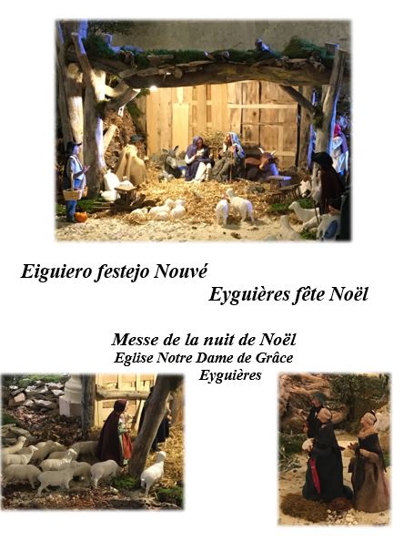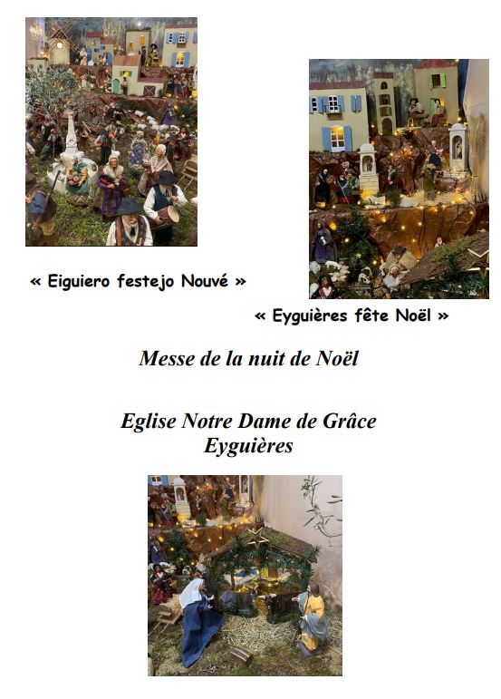 Messes le 24 décembre 17h à Lamanon 19h à Sénas (crèche vivantes des enfants du catéchisme et pastrage) 21h à Aureille 23h30 veillée provençale puis à minuit messe à Eyguières Messe du jour de Noël (dimanche 25 décembre) 11h à Eyguières