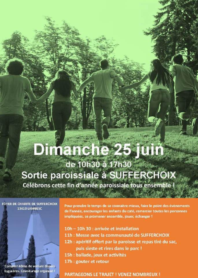 Sortie paroissiale de fin d’année : dimanche 25 juin à Sufferchoix. Le Programme (pas encore définitif) : -10h/10h30- Arrivée et installation ; il est prévu d’organiser un covoiturage pour permettre à tous les paroissiens qui le désirent, des tout-petits aux papis et mamies, de pouvoir participer à cette fête de famille. Ce sera une occasion d’encourager les enfants […]