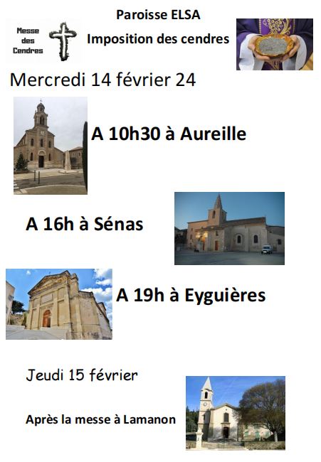 Voici les horaires des Messes des Cendres : Mercredi 17/02 – Sénas – 11h00 Mercredi 17/02 – Eyguières – 16h00Jeudi 18/02 – Lamanon – 10h00Samedi 20/02 – Aureille – 10h00 Récollection d’entrée en Carême – 16h00 Messe