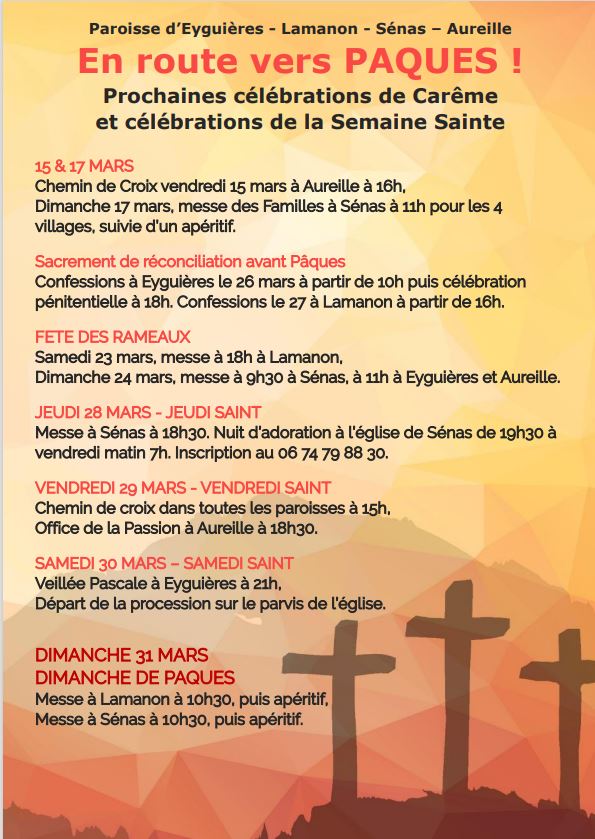 ATTENTION : LA MESSE DES RAMEAUX D’EYGUIERES 28 MARS AURA LIEU A 11H00 (et non 10H00 comme indiqué dans le document)